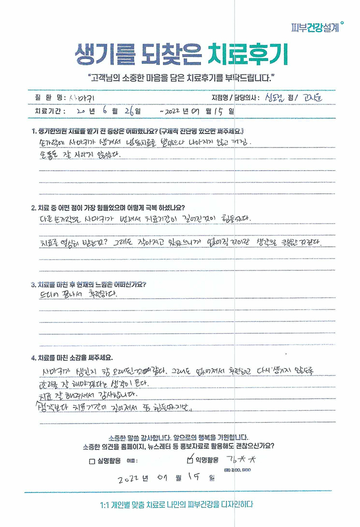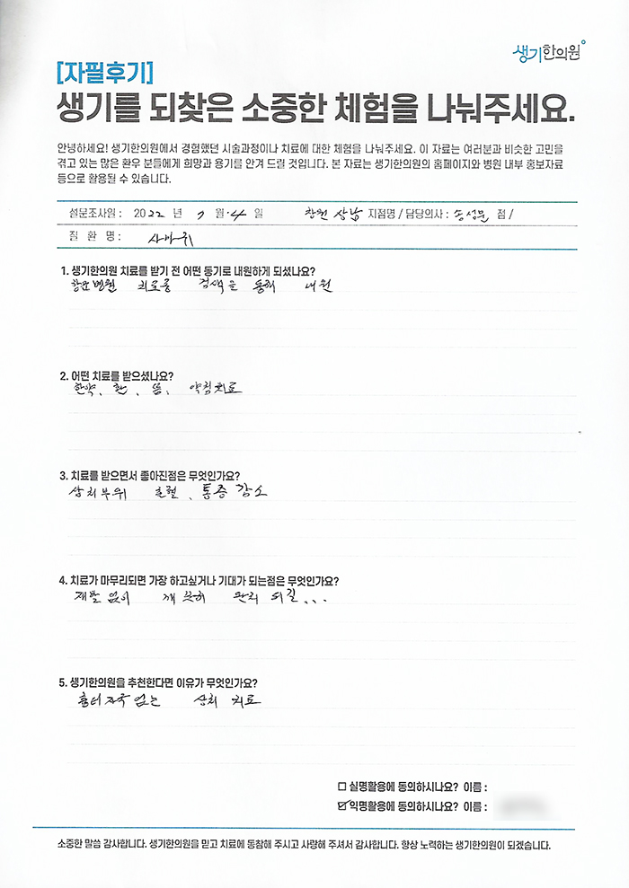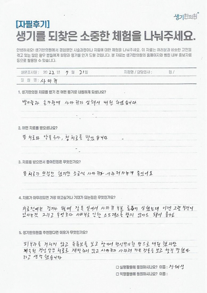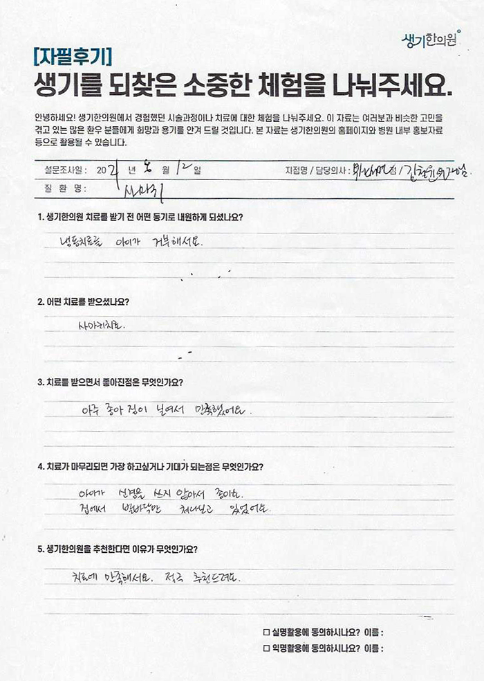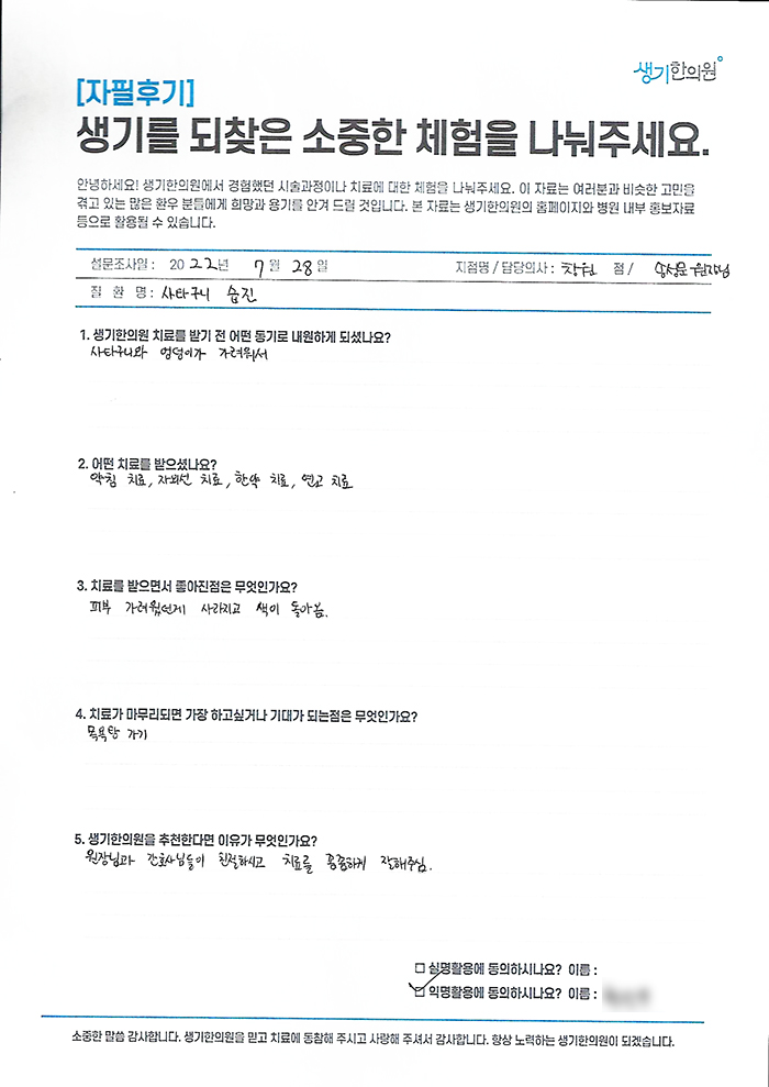 생기한의원과 함께하신 생생한 자필 및 영상 후기를 소개합니다.