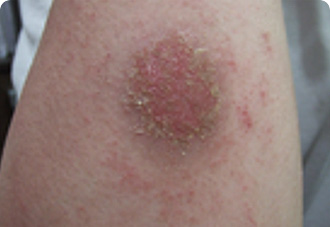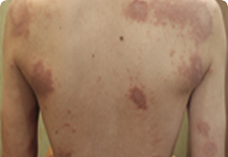 초기에는 홍반성 구진과 소수포로 나타나 점차 커지고 융합되어 동전 모양으로 변합니다.