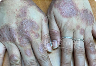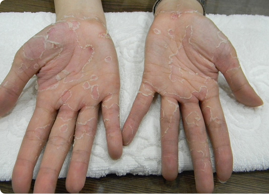 손에 비늘을 동반한 홍반 및 갈라짐, 물집, 진물이 생기고 심한 건조감과 및 손등까지 번질 수 있습니다.