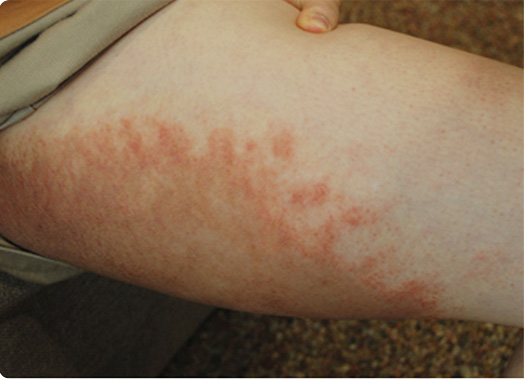 심한 가려움을 동반하며, 경계가 분명한 바퀴 모양으로 점점 다른 부위로 넓어지고 색소 침착이 일어납니다.